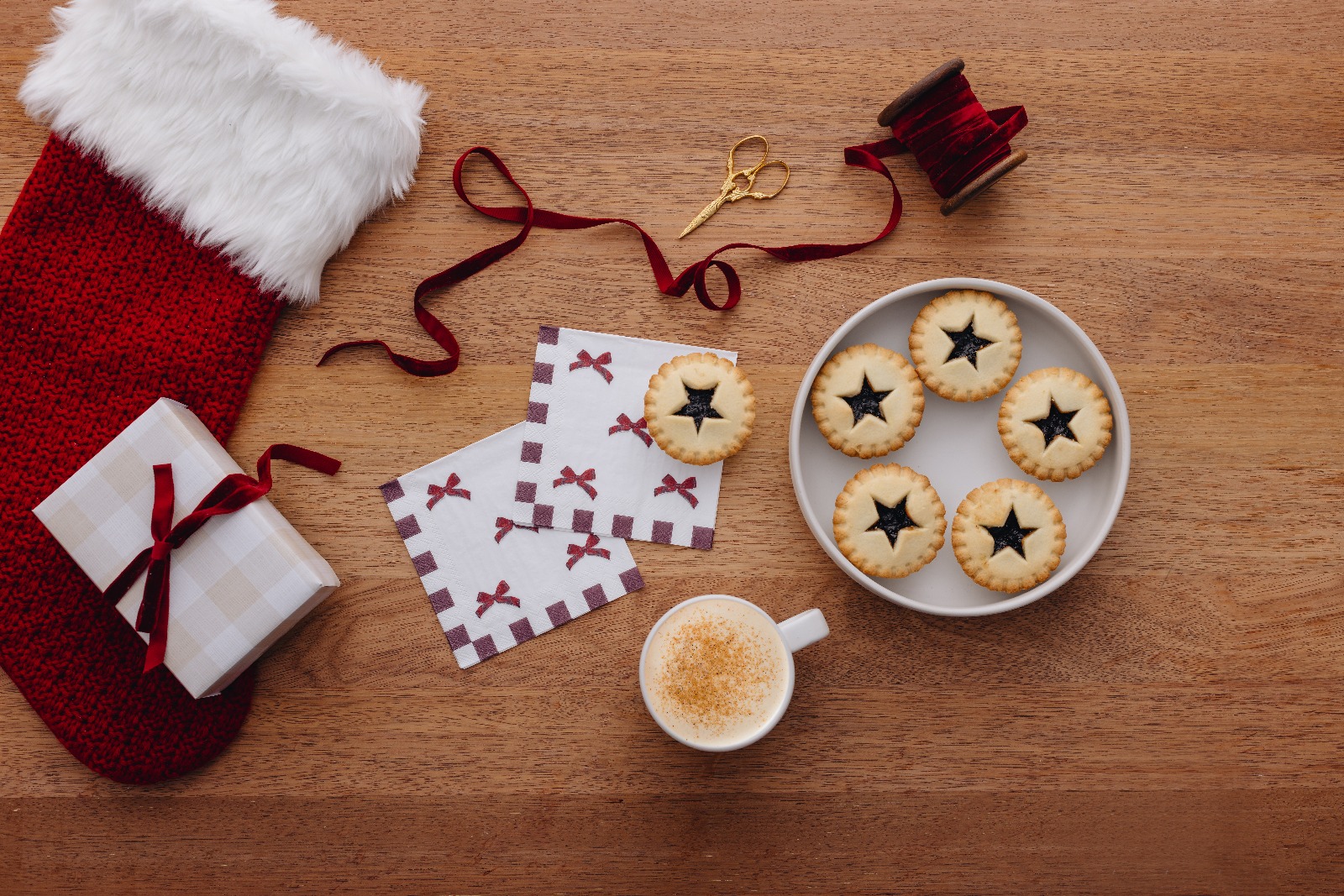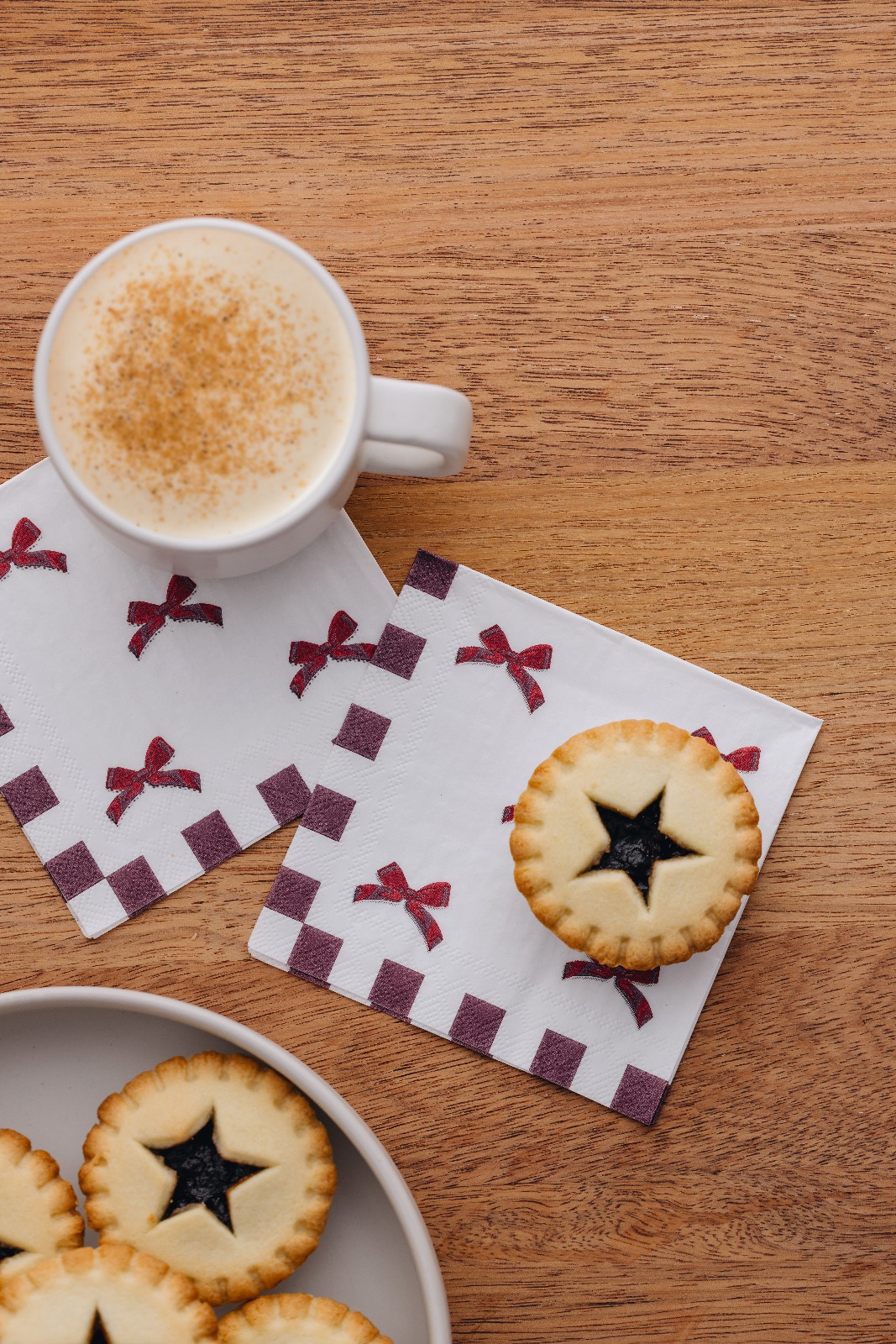 Minimalistische kerstservetten met rode strikjes en rood-witte geblokte rand – luxe papieren cocktailservetten in een set van 20.