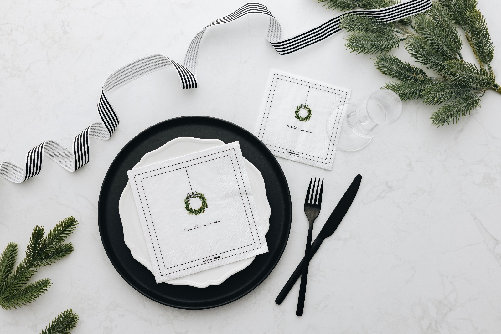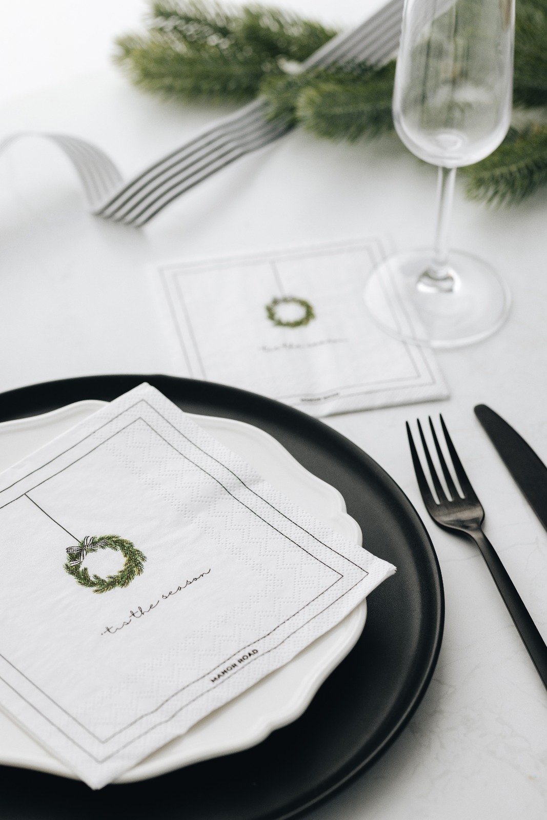 Minimalistische witte kerstservetten met een groene krans en de tekst “’Tis the Season” in cursief – verkrijgbaar in cocktail en luncheon formaat (set van 20).